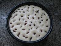 9.然后,将拌好的面糊倒入模具中,搁入已清洗好的葡萄干。